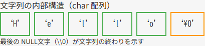 C言語では、文字列は char 型の配列 として扱われます。そして必ず最後に NULL文字(’\0’) が付くのが大きな特徴です