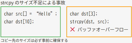 }コピー先の配列サイズが足りないと、メモリ破壊の原因になります