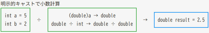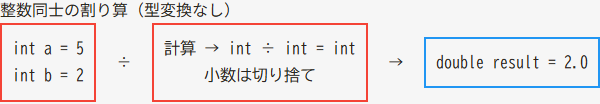 result = 2.500000ここで行っているのが 明示的な型変換(キャスト) です